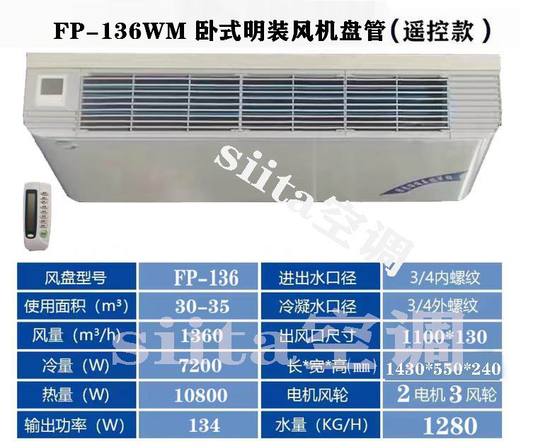 FP-136WM是德州春意卧式明装风机盘管的常见型号之一,属于中央空调末端设备,适用于中小型空间。以下是其核心性能参数和典型应用场景的详细介绍: